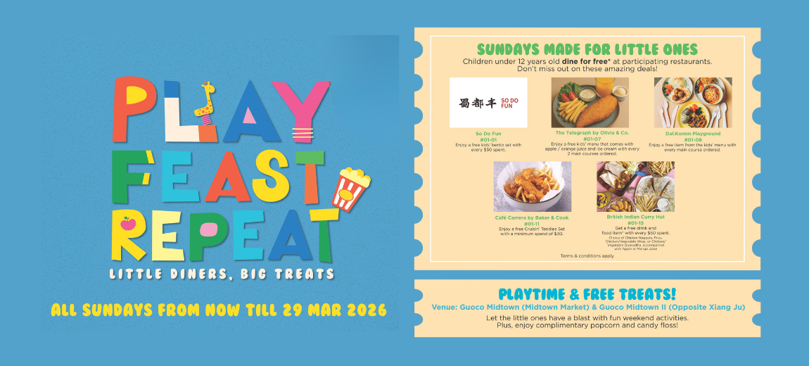 Enjoy your meals while the little ones enjoy an endless free fun at the Playground at Guoco Midtown (Midtown Market) and Guoco Midtown II (opposite Xiang Ju). Plus, enjoy free treats at both locations every Sunday, from 11am to 2pm.